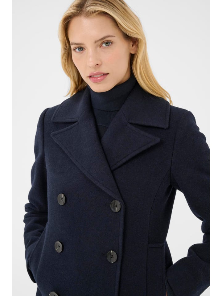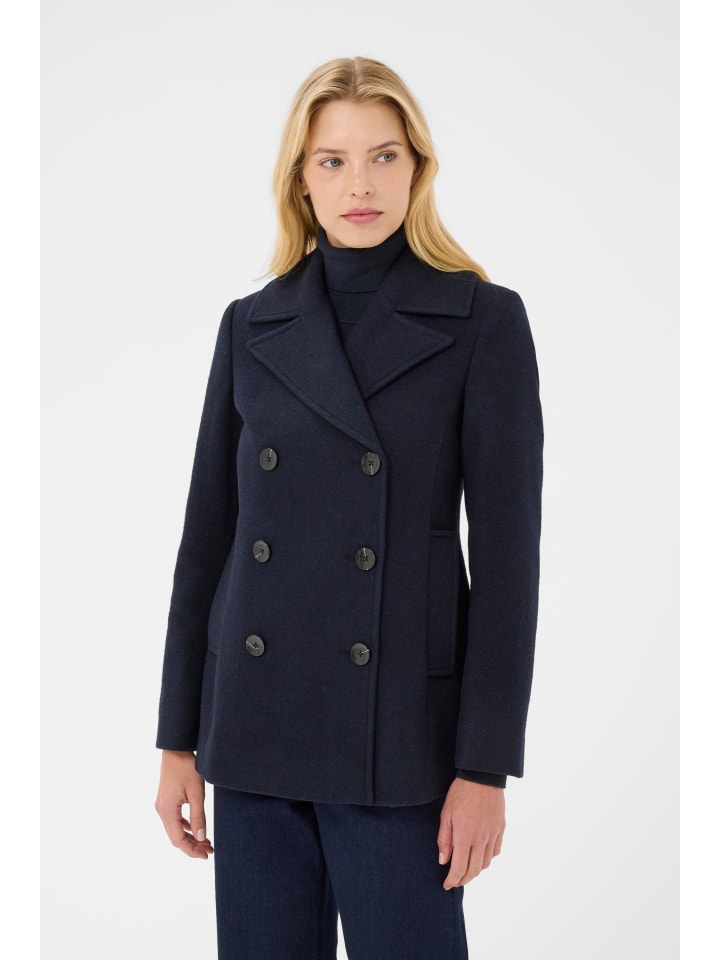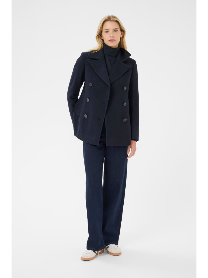 Двубортное пальто прямого покроя с выразительными лацканами и передними карманами. Структурированный вид достигается за счет эффектных пуговиц и лаконичного дизайна.