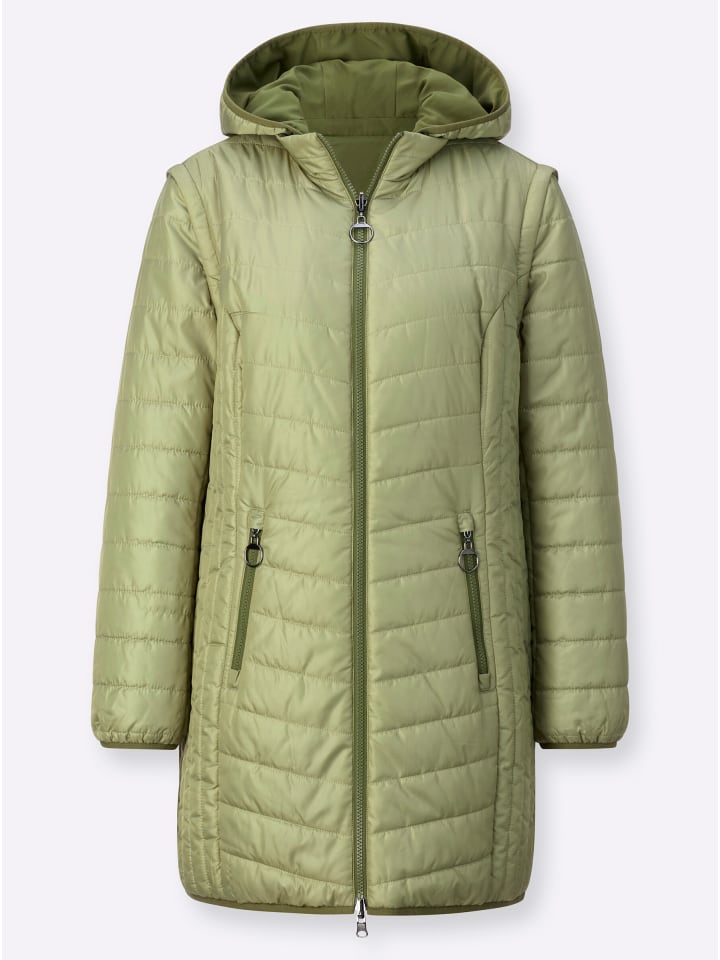 Повседневная универсальная куртка с двусторонним дизайном и отстегивающимися рукавами: 1 длинная куртка - 4 способа носить, создавая каждый раз новый образ! Воротник-стойка со съемным капюшоном. Практичная двухсторонняя молния. Косые карманы на молнии с карманами для предотвращения зацепления. Щипцы для идеальной посадки.