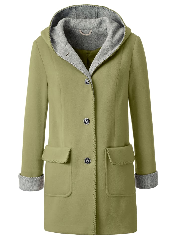 ...и зима может наступить! Приятная теплая куртка с шерстяным эффектом. Декоративная строчка по краям. Контрастный капюшон, планка на пуговицах и приталенные манжеты создают красивый контраст. Планка на пуговицах по всей длине, два кармана с клапанами. Формирующие передние швы, центральный шов сзади.