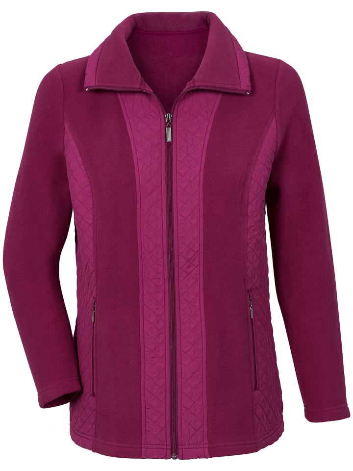 Стеганые тканые вставки на молнии и по бокам добавляют стильный штрих! Флисовая куртка с отложным воротником и застежкой-молнией. Два кармана на молнии. Вытачки спереди и сзади обеспечивают отличную посадку. Антипиллинговая отделка предотвращает образование катышков.