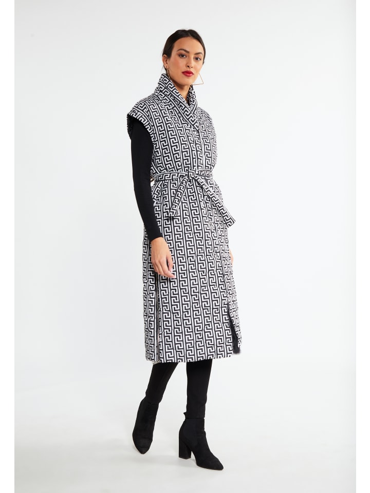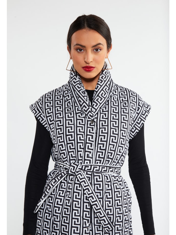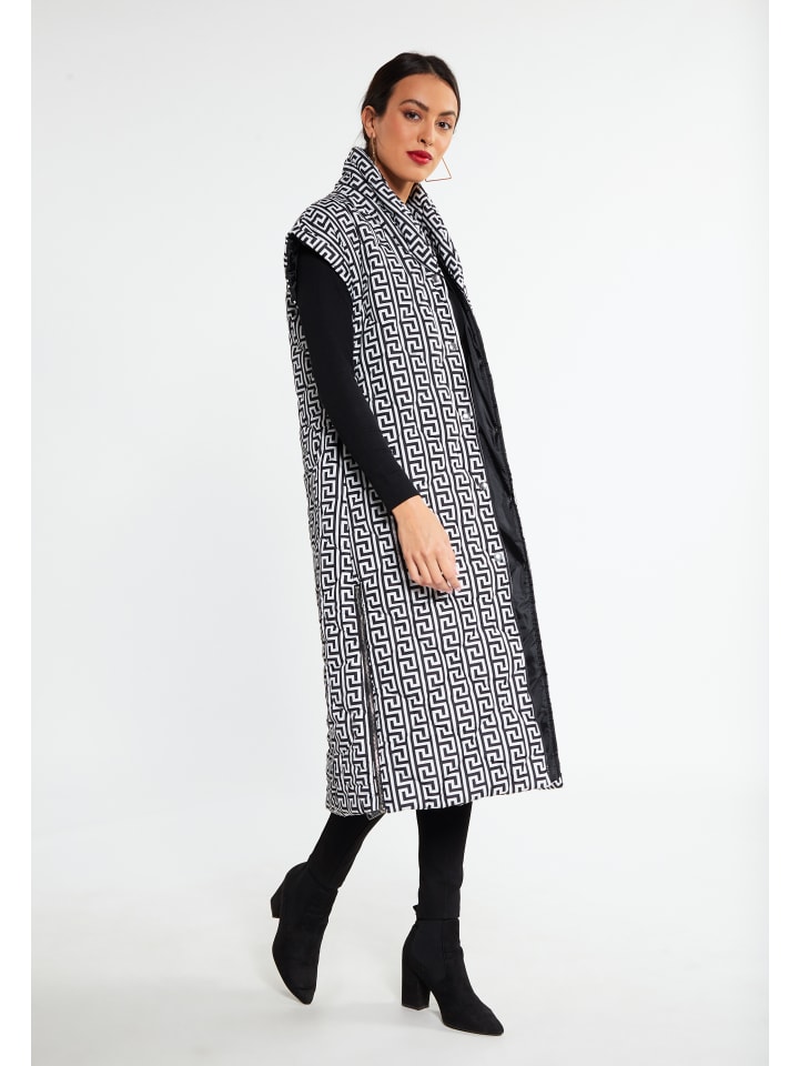 Стеганый жилет от Faina с легкой подкладкой и мягкой глянцевой отделкой. Элегантный удлиненный силуэт застегивается на кнопки. Короткие рукава и высокий воротник придают ему особую женственность. Стеганый дизайн можно дополнить подходящим ремнем. Жилет доступен в черном или черно-белом цвете.