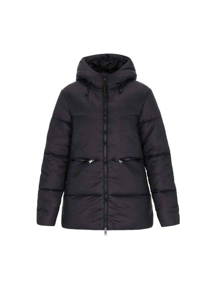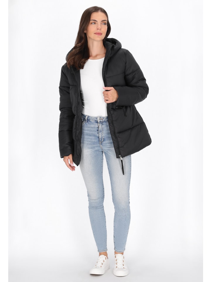 - Короткое пальто классического кроя с капюшоном и длинными рукавами