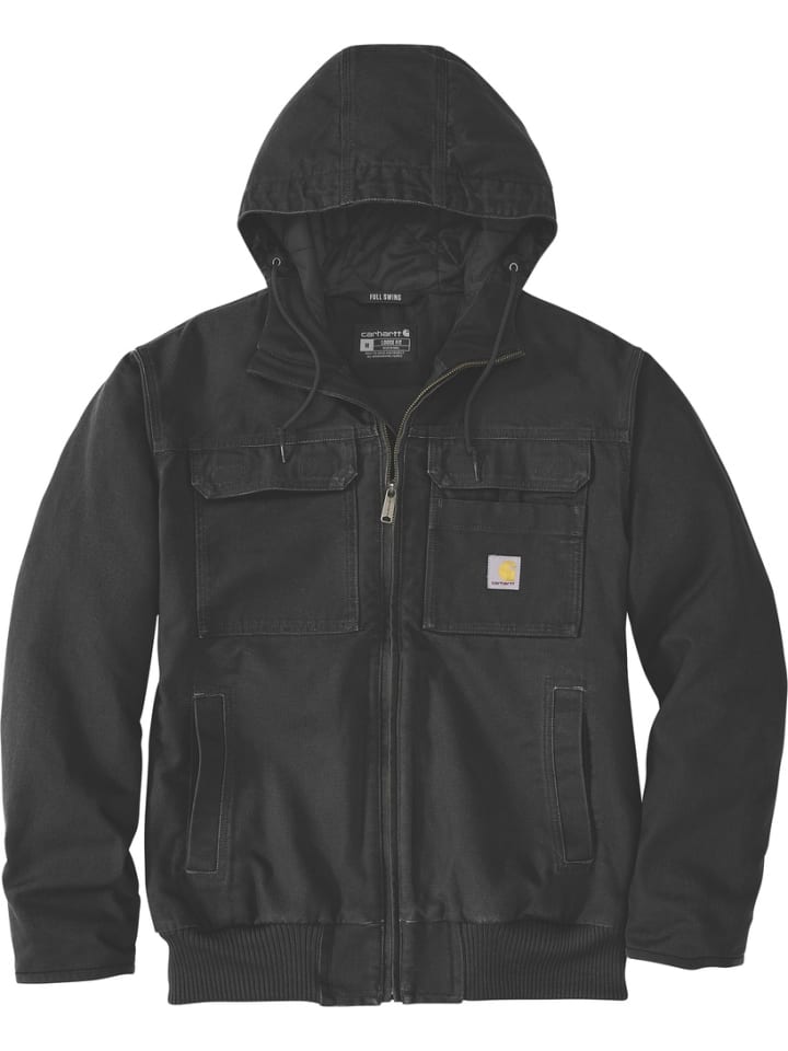 Свободный крой · 12 унций/ярд² - 407 г/м² · 100% хлопок · Мягкая утка · Подкладка: стеганая тафта · Утеплитель: утеплитель Syncloud Loft · Mighty Back - двубортный крой между плечами для большей свободы движений · Rugged Flex - облегчает движение · Full Swing - большая свобода движений · Wind Fighter - останавливает ветер · Пришитый стеганый трехсекционный капюшон с регулируемым шнурком · Длинные рукава · Два нагрудных кармана с клапанами и застежкой на липучке · Два передних кармана на молнии · Передняя молния во всю длину с защитой подбородка · Ребристые манжеты на внутренней стороне рукавов · Ребристый пояс · Тройные основные швы · Пришита этикетка Carhartt карман