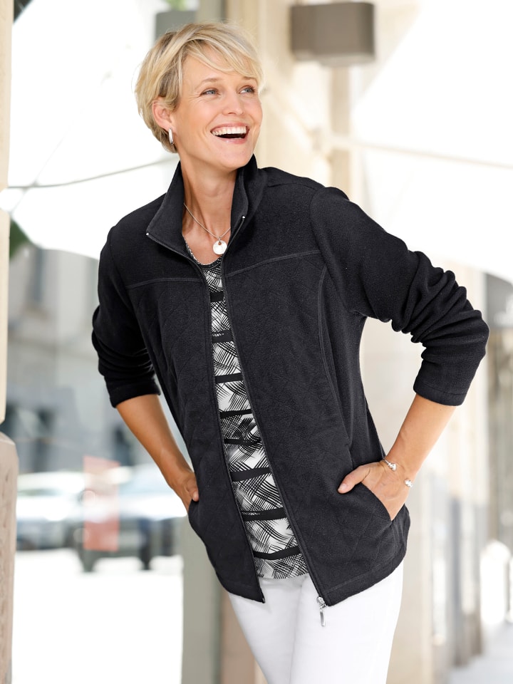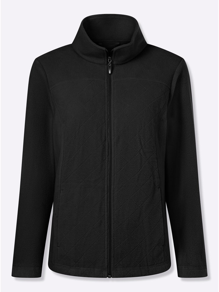 Уютная и мягкая, идеально подходит для прохладных дней: флисовая куртка с ромбовидным узором. Формирующие швы спереди и сзади. Дополнительные детали: защитный воротник-стойка, молния по всей длине и два кармана в швах.