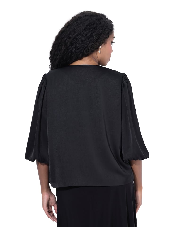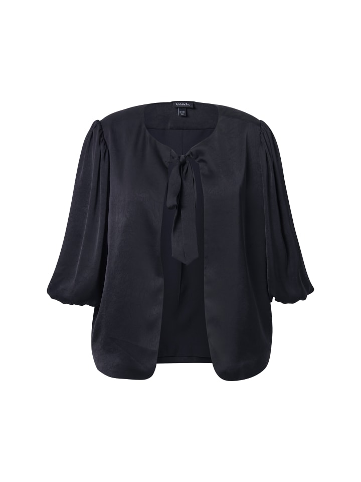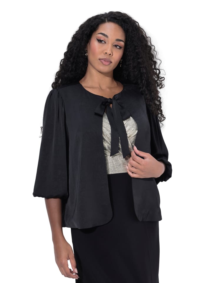 Куртка, слегка укороченного покроя, с декоративной застежкой-бантом на круглом вырезе. Широкие рукава 3/4 с присборенными манжетами. Полностью на подкладке.