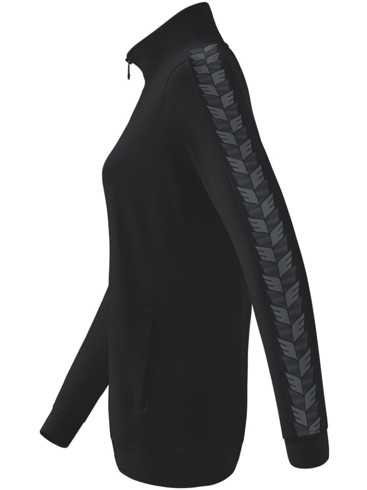 Удобный и прочный материал; воротник-стойка; ребристые манжеты и подол; боковые карманы на молнии; принт с крыльями ERIMA на плечах и рукавах; приталенный крой.