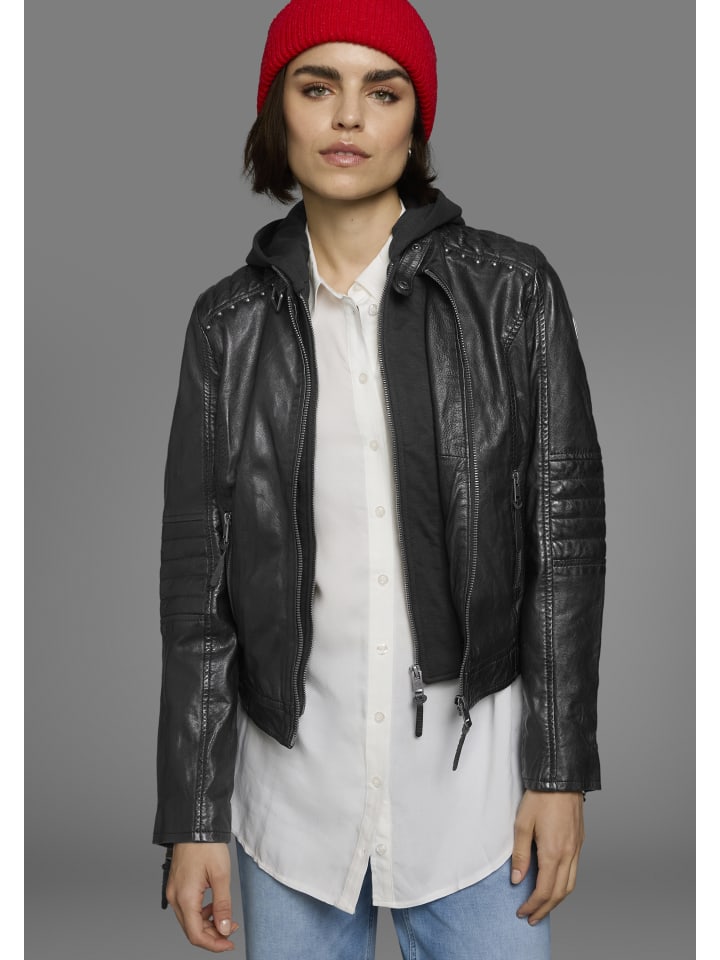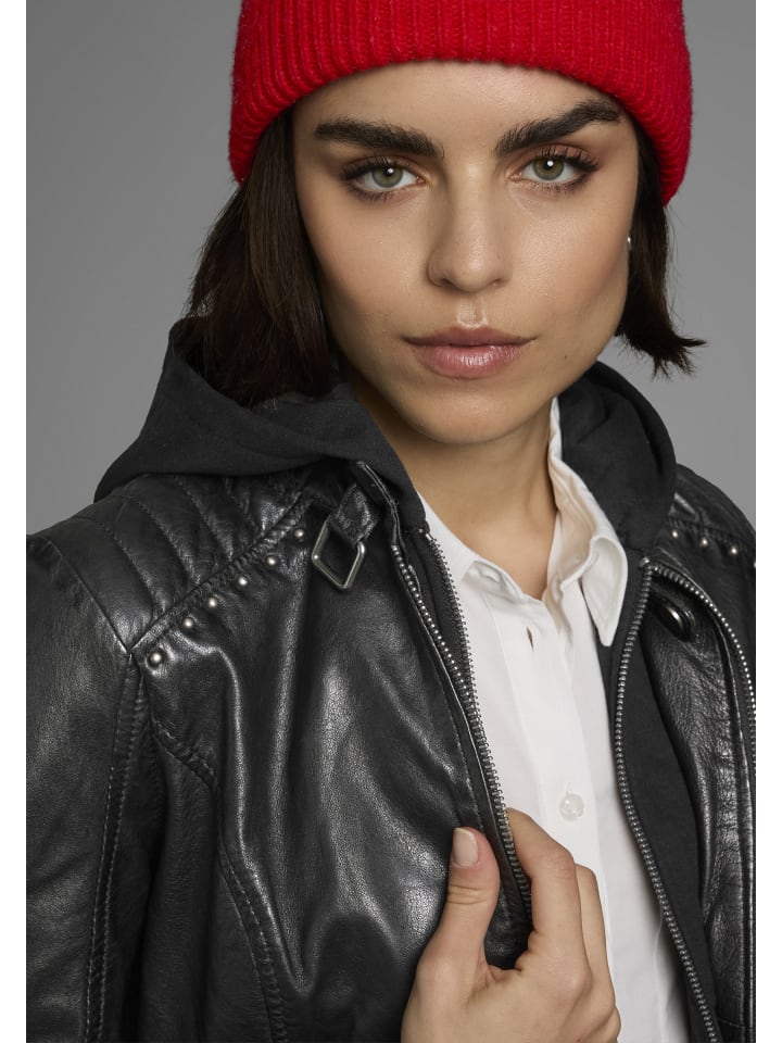 - Стильная кожаная куртка со съемным капюшоном для создания универсальных образов.