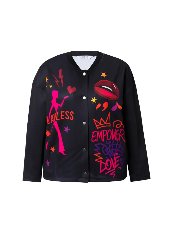 Куртка для колледжа, слегка свободного кроя, из мягкой, мерцающей ткани, напоминающей свитшот, с ярким принтом. Ребристый университетский воротник, спущенная линия плеча, длинные рукава. Застежка на кнопки, 2 кармана, полностью на подкладке.