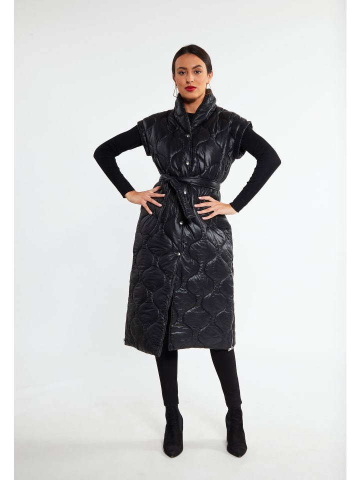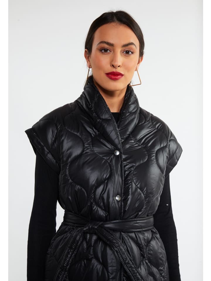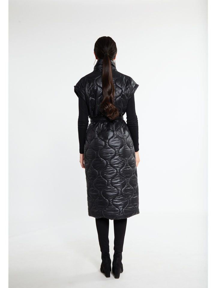 Стеганый жилет от Faina с легкой подкладкой и мягкой глянцевой отделкой. Элегантный удлиненный силуэт застегивается на кнопки. Короткие рукава и высокий воротник придают ему особую женственность. Стеганый дизайн можно дополнить подходящим ремнем. Жилет доступен в черном или черно-белом цвете.