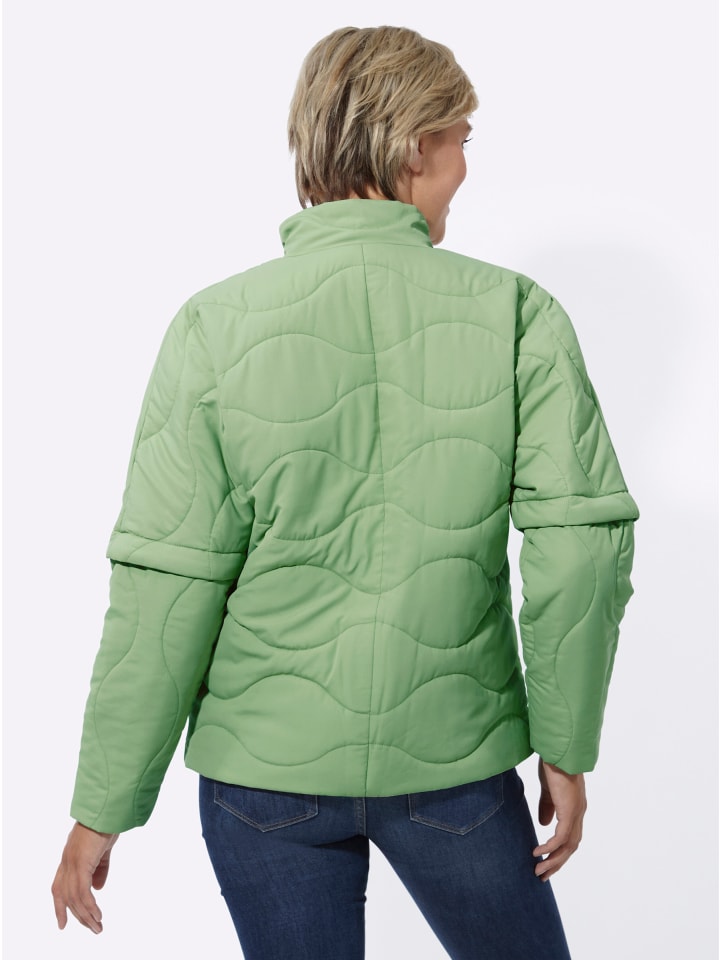 Идеально подходит для межсезонья: куртка с двумя функциями. Благодаря отстегивающимся рукавам эту куртку можно носить как жилет. Имеет модную волнистую стежку, защитный воротник-стойку и застежку-молнию. Два косых прорезных кармана и один внутренний карман на пуговице.