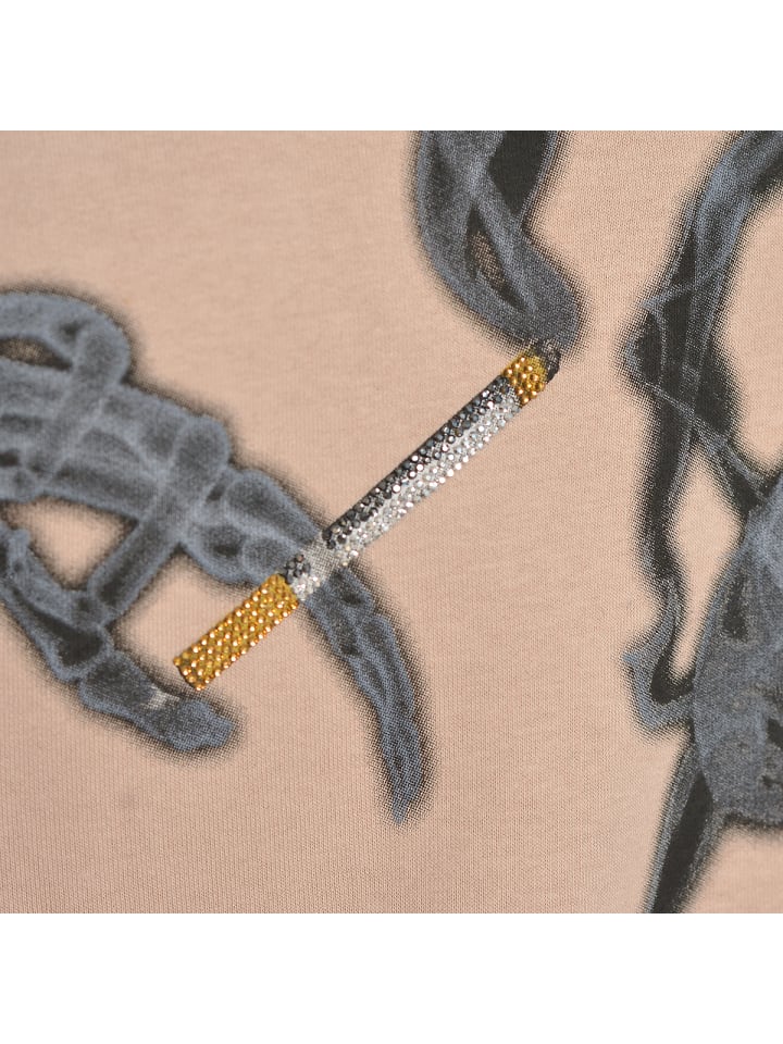 Череп-скелет неторопливо курит сигарету, выпуская много дыма.