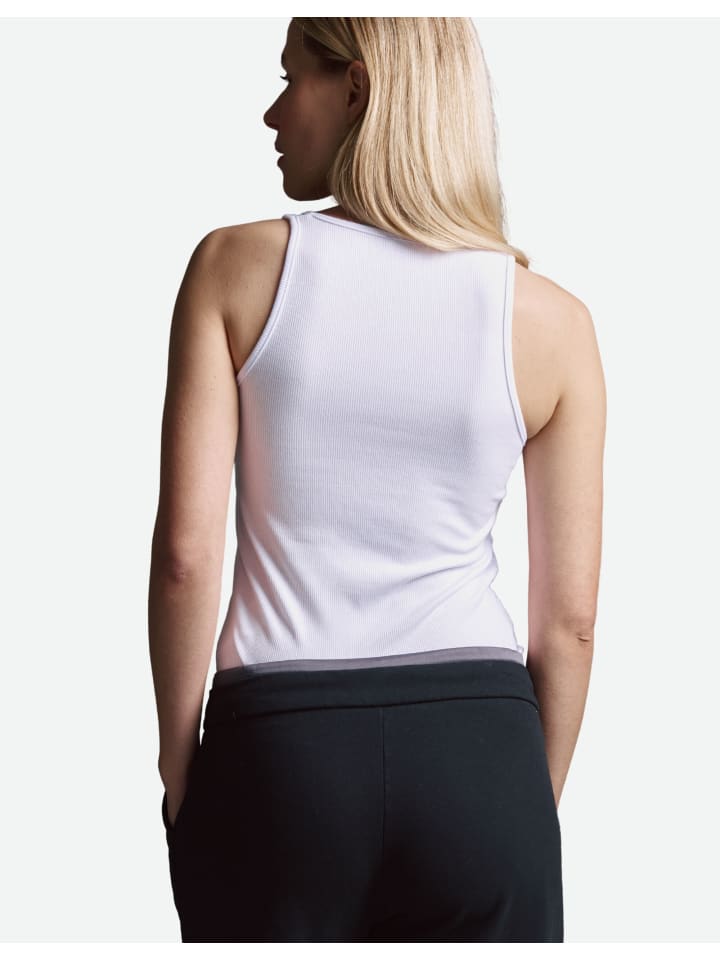 Классический, лаконичный и универсальный: эта майка впечатляет своим спортивно-женственным стилем. Узкий ребристая конструкция обеспечивает облегающую посадку, а круглый вырез подчеркивает вневременную непринужденность. Изящный акцент - вышитый логотип спереди, который добавляет современный штрих к минималистичному образу.