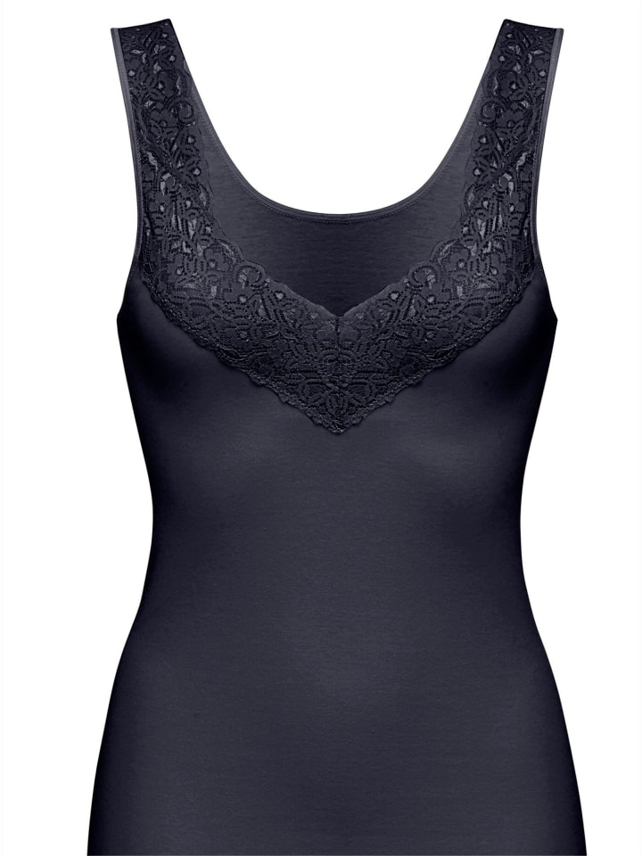 Топ без рукавов от Wäschepur с нежной эластичной кружевной отделкой, которая переходит на удобные широкие бретели. Тонкая вязка в рубчик.