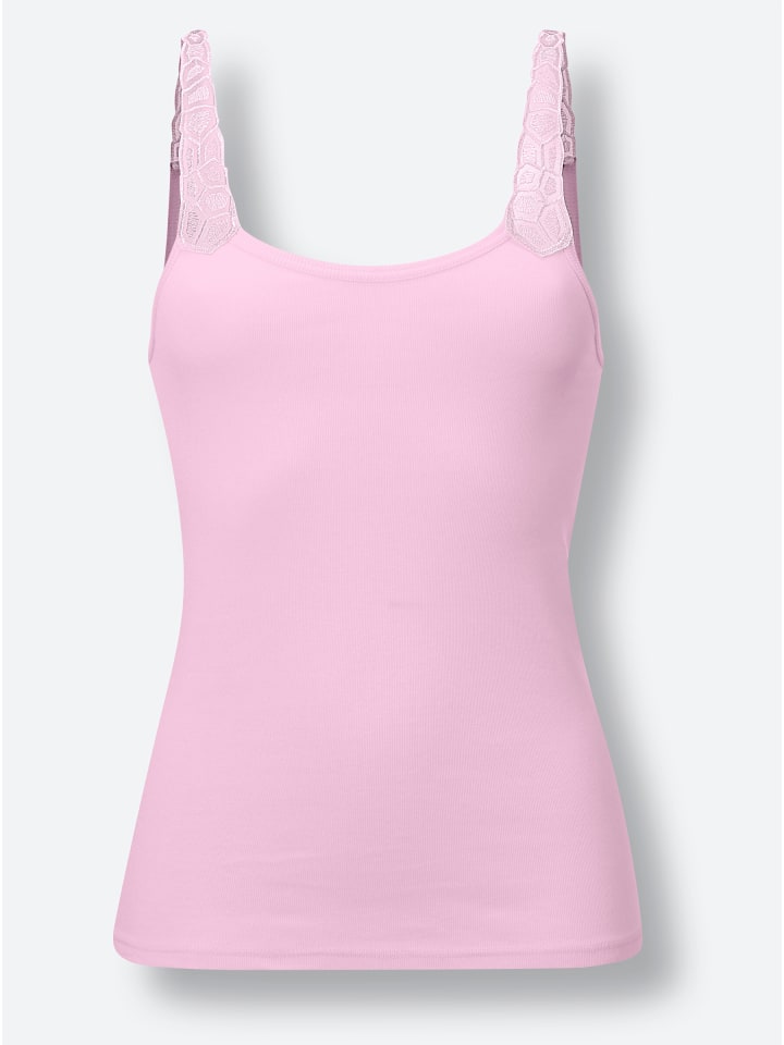 Элегантное кружево украшает бретельки этой майки от Wäschepur. Круглый вырез горловины отделан тонкой окантовкой.