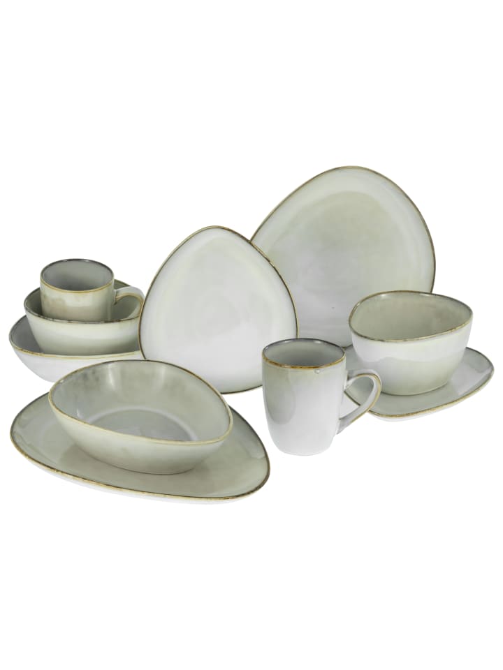 Эта красивая столовая посуда отличается современной, органичной и нестандартной формой с легкой, мутной глазурью, доступной в 3 цветных реактивных глазурях: Smoke Blue, Off-White или Sand (здесь показан Off-White!).
