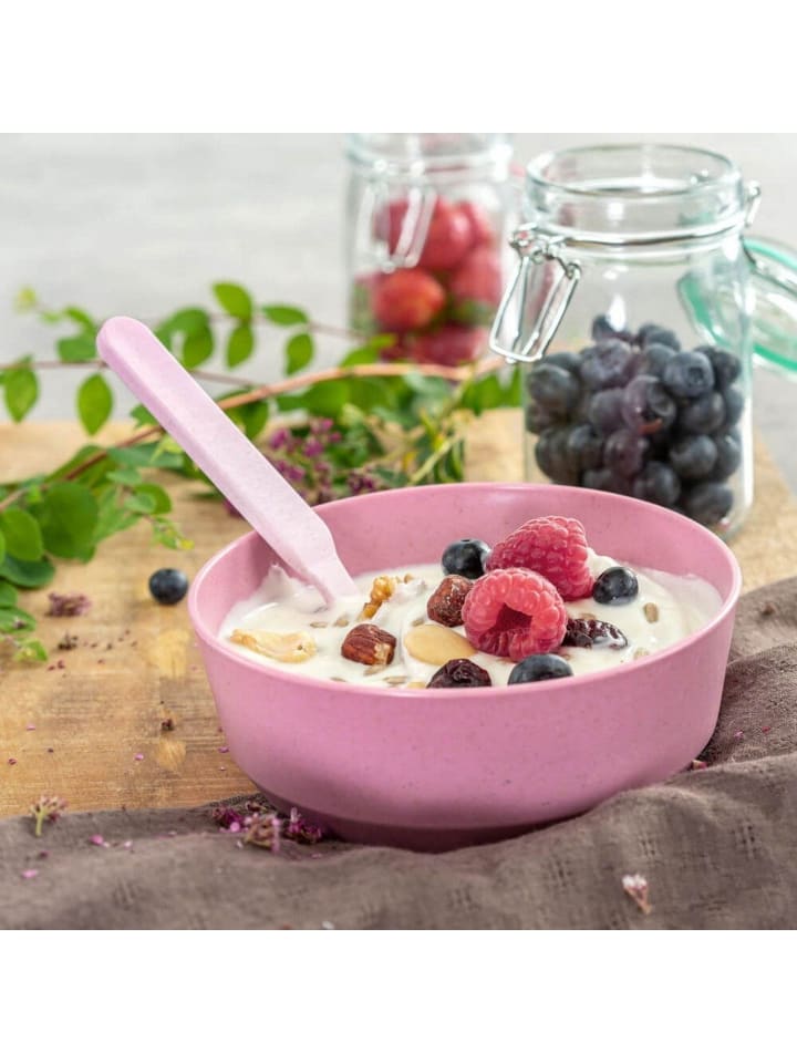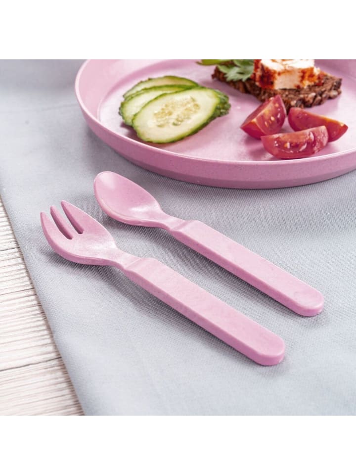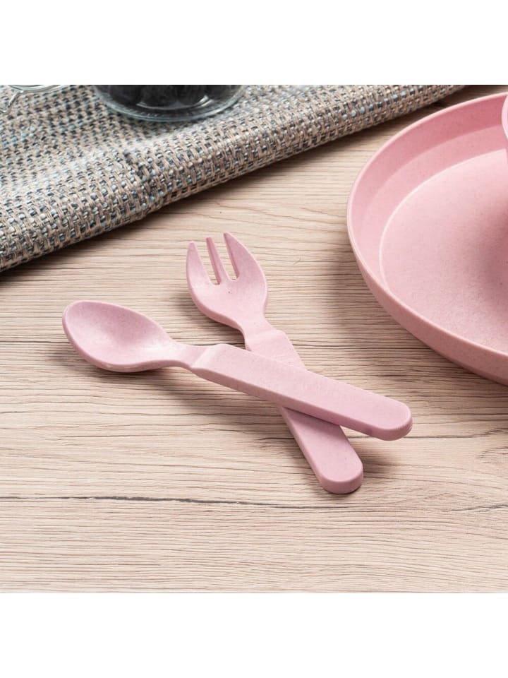 Столовые приборы можно мыть в посудомоечной машине, что упрощает уход. Экологичность также является приоритетом при его производстве, поскольку 80% сырья поступает из возобновляемых источников. Его яркий розовый цвет вызывает интерес у малышей и гарантирует, что каждое блюдо станет особенным.