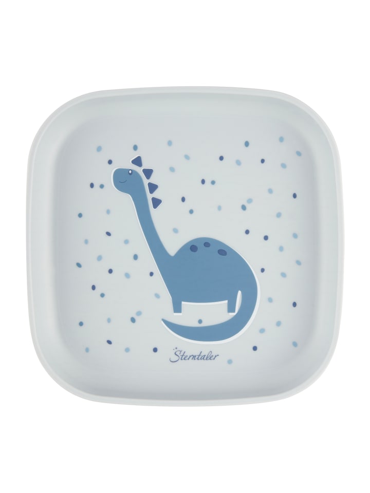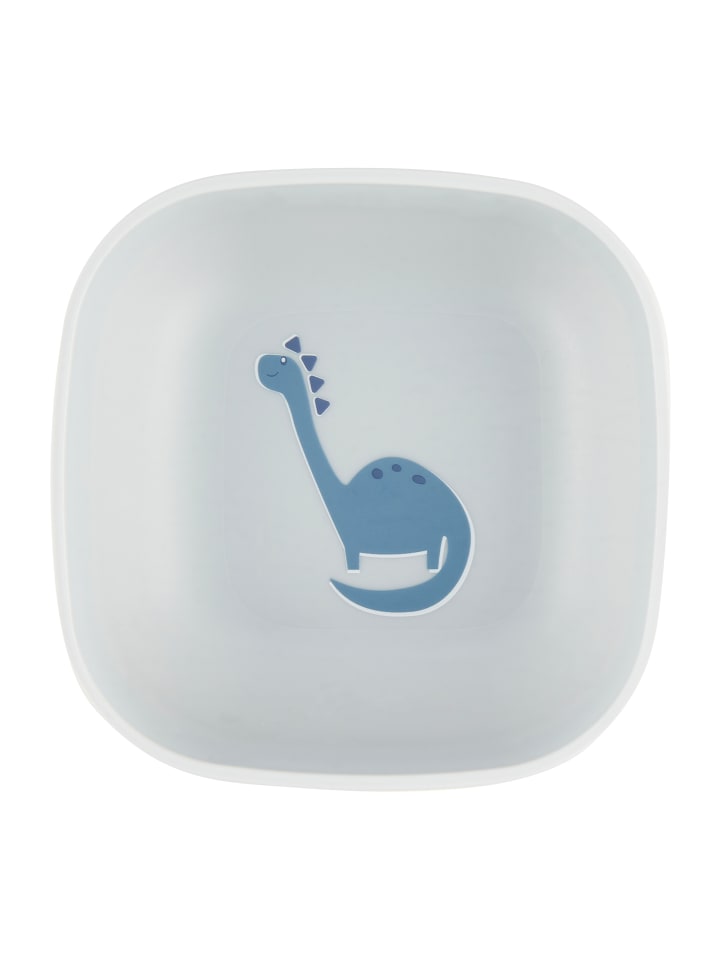Набор столовой посуды Dino Rexi /// квадратной формы /// изготовлен из прочного и безопасного для пищевых продуктов полипропилена /// с изображением динозавра и пятен на серо-голубом фоне