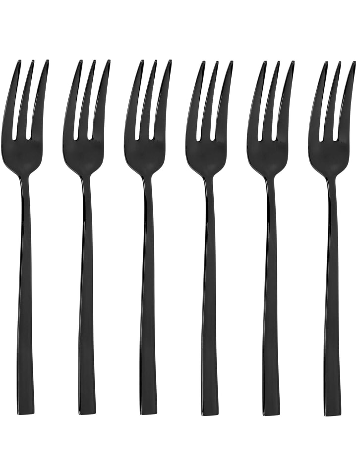 Элегантные вилки для торта из нержавеющей стали, пригодные для мытья в посудомоечной машине. Количество вилок: 6. Технические данные: Характеристики продукта - Характеристика 1: 18/10; Общие сведения - Цвет: черный; Характеристики - Да, 18/10; Тип - Тип: Вилка; Характеристики - Можно мыть в посудомоечной машине; Общие сведения - Материал: нержавеющая сталь; Характеристики продукта - Характеристика 2: Можно мыть в посудомоечной машине; Характеристики - Поверхность: матовая