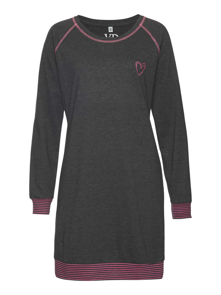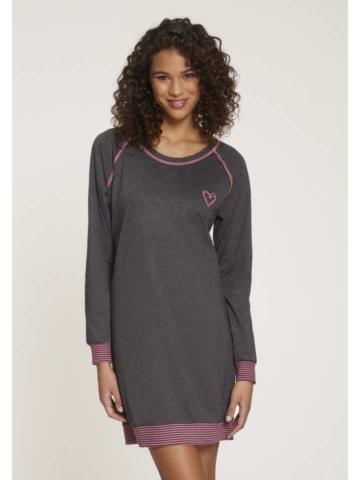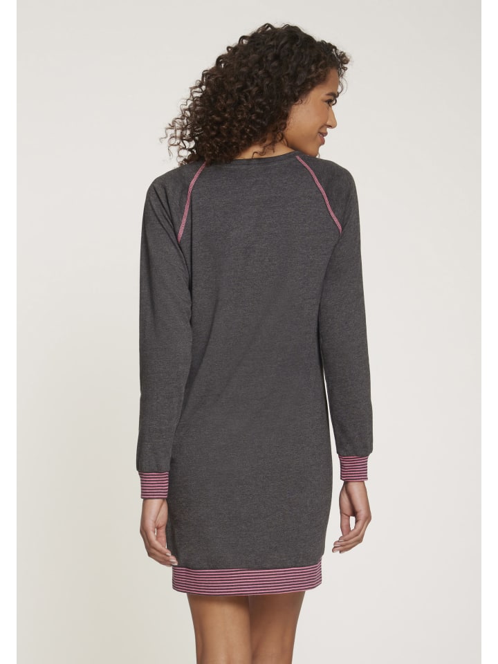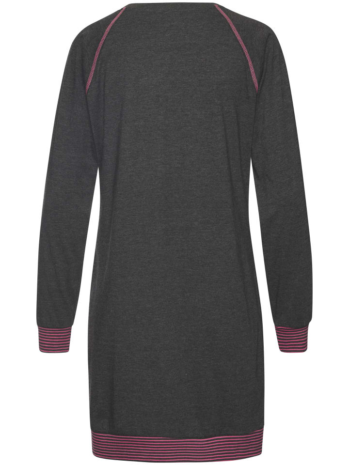 Ночная сорочка с рукавами реглан и контрастной строчкой. Небольшой принт спереди на груди и полосатые ребристые манжеты по низу. Комфортное качество, изготовлено из 60% хлопка, 40% полиэстера.