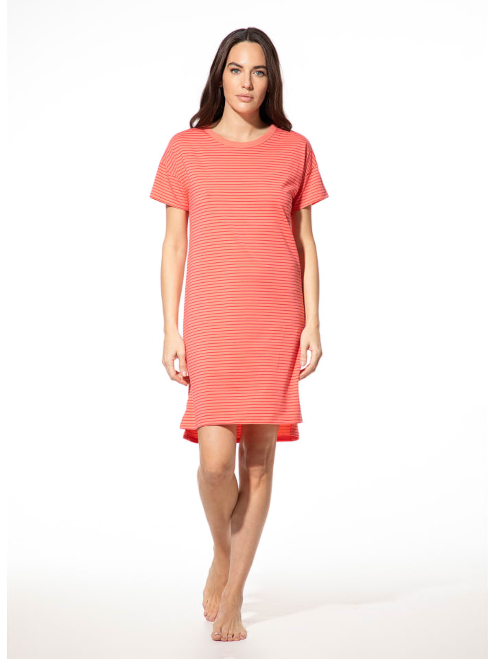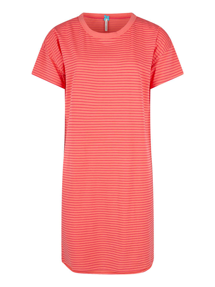 Эта ночная рубашка с короткими рукавами от SHORT STORIES выполнена в современном полосатом стиле модного дынного цвета. Более темные полоски создают стильный образ. Благодаря мягкому составу (95% хлопка и 5% эластана) она удобна в носке и обеспечивает оптимальную свободу движений. Спущенная линия плеч, слегка удлиненная спинка с боковыми разрезами и однотонный круглый вырез горловины придают ночной рубашке непринужденный вид. Идеально подходит для уютных ночей с максимальным комфортом.