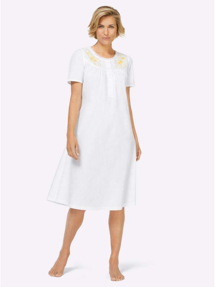 Ночная сорочка из высококачественного батиста - идеально для теплых летних ночей! Чуть более широкий круглый вырез с отделкой из хлопкового кружева. Закругленная кокетка с контрастной вышивкой и сборками. Длинная планка с пуговицами. Изящная сборка на коротких рукавах. Удобный А-образный силуэт.