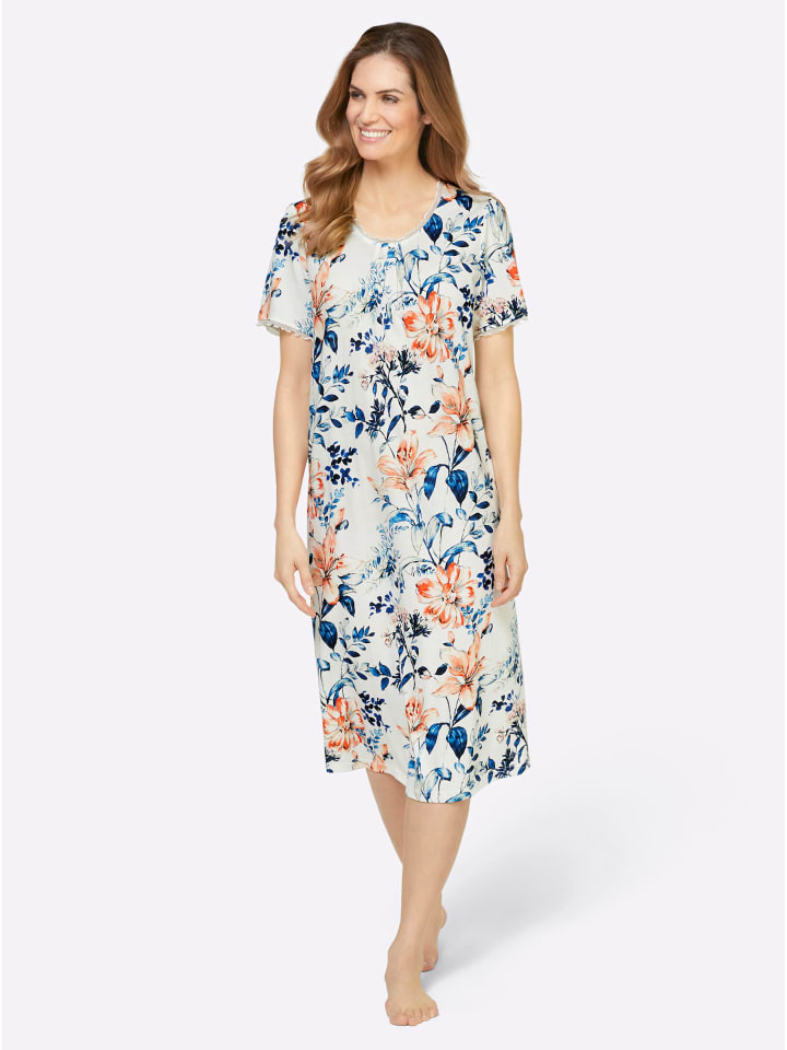 Чудесно мягкая ночная рубашка от Wäschepur с цветочным принтом по всей поверхности. Круглый вырез горловины украшен изящными складками, а также манжеты слегка присборенных рукавов украшены сеткой. Трикотаж.