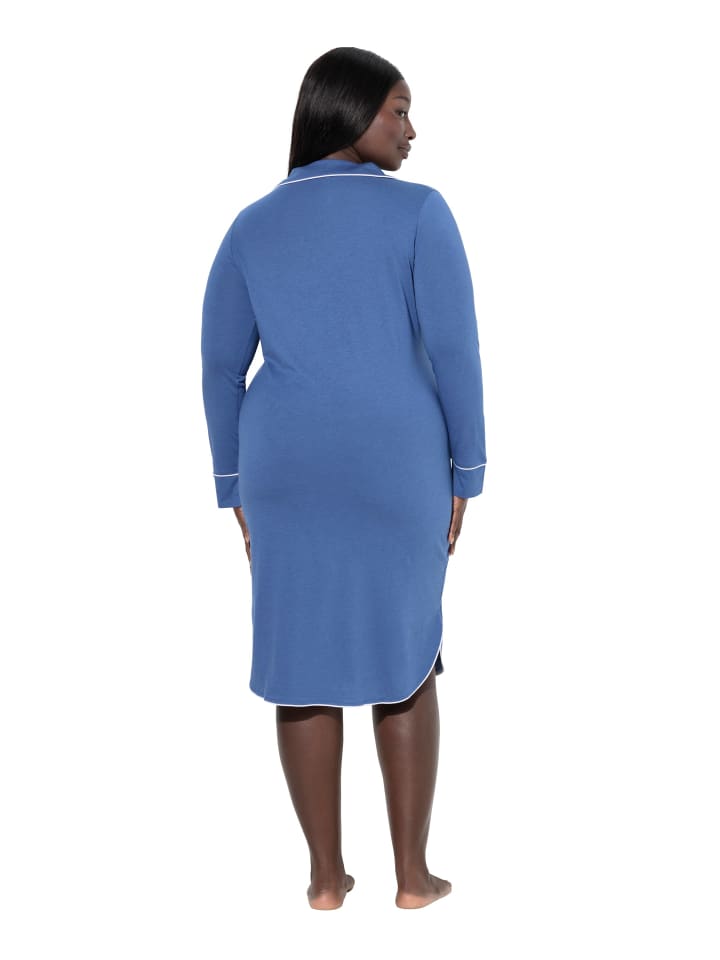 Ночная рубашка в пижамном стиле с декоративной окантовкой. V-образный вырез с отложным воротником, длинные рукава. Слегка закругленный подол с боковыми разрезами для дополнительного комфорта.