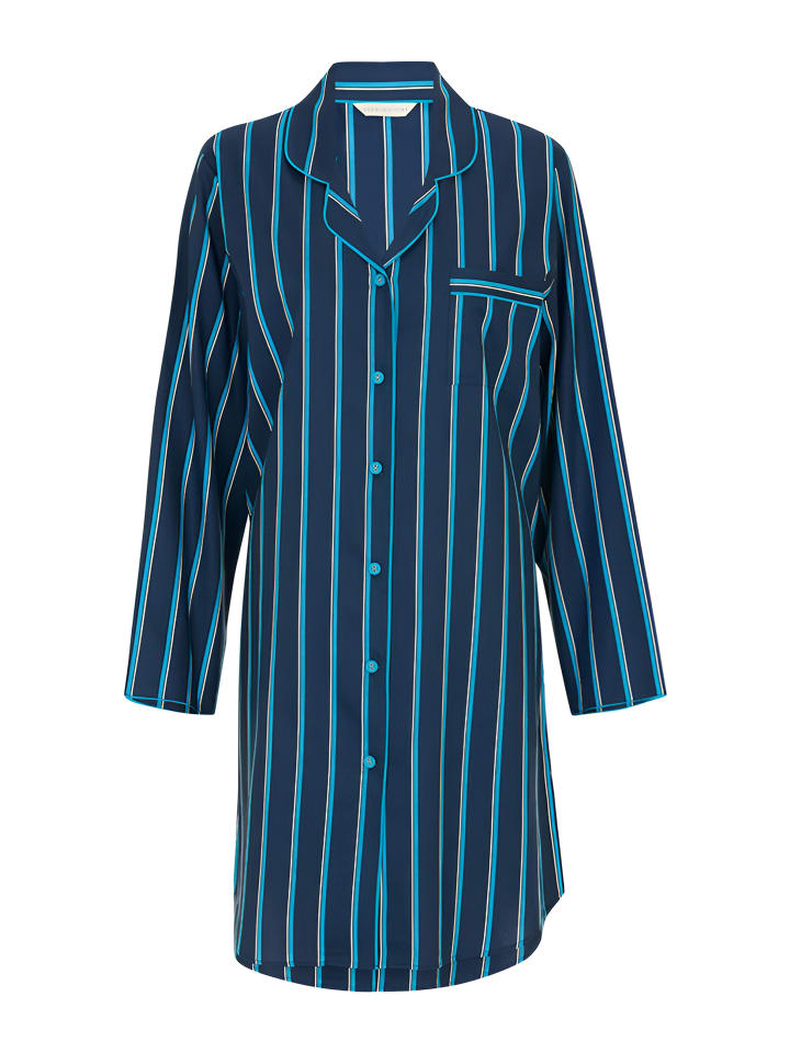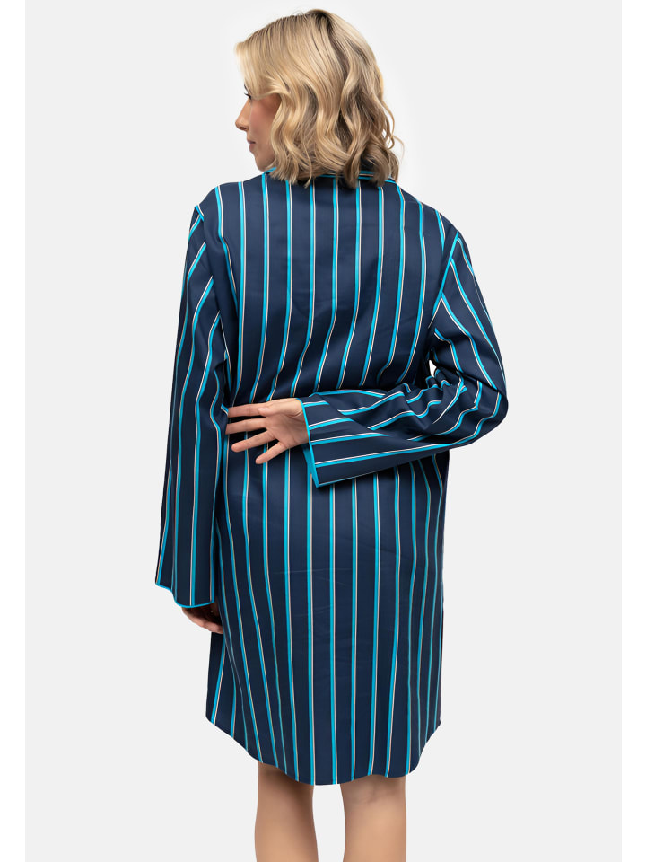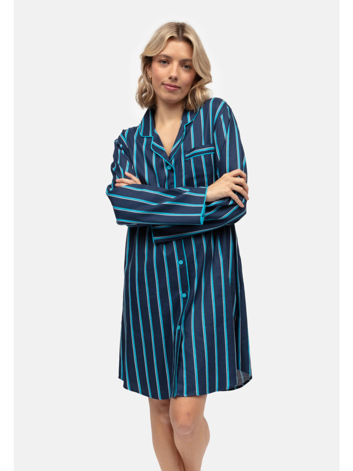Ночная рубашка для спокойного сна. Благодаря невероятно мягкому хлопково-модальному плетению эта ночная рубашка обеспечит комфорт с первой минуты. Темно-синие и бирюзовые полоски придают ей спокойный, структурированный вид, а свободный крой обеспечивает достаточно места для комфортного сна. Длинные рукава удобно сидят, а фигурный подол доходит до середины бедра, создавая мягкую драпировку, идеально подходящую для отдыха. Благодаря заостренным отворотам, отделке из бирюзового модала и соответствующим пуговицам, обтянутым модалом, эта ночная рубашка выглядит изысканно.