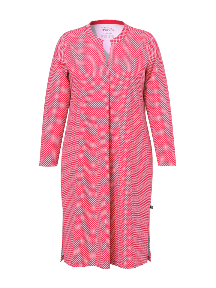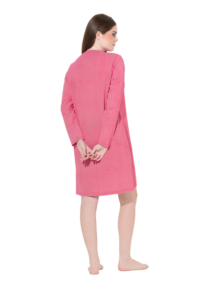 Ночная сорочка, удобного кроя, из мягкого узорчатого трикотажа. Круглый вырез с разрезом, длинные рукава. Боковые разрезы для мягкого драпирования. Сертифицировано OEKO-TEX.