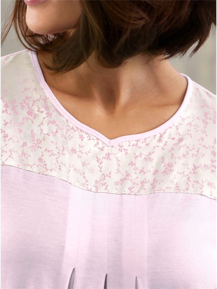 Элегантная ночная рубашка с элегантно мерцающим атласом с цветочным принтом на вырезе в форме сердечка. Плиссировка спереди. Закругленные разрезы на манжетах рукавов.