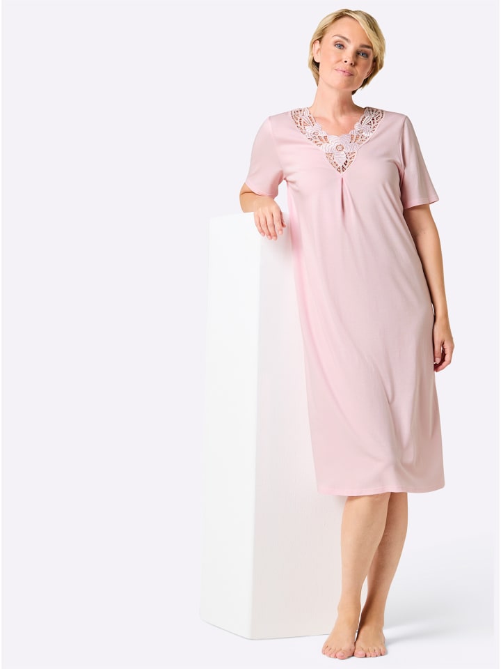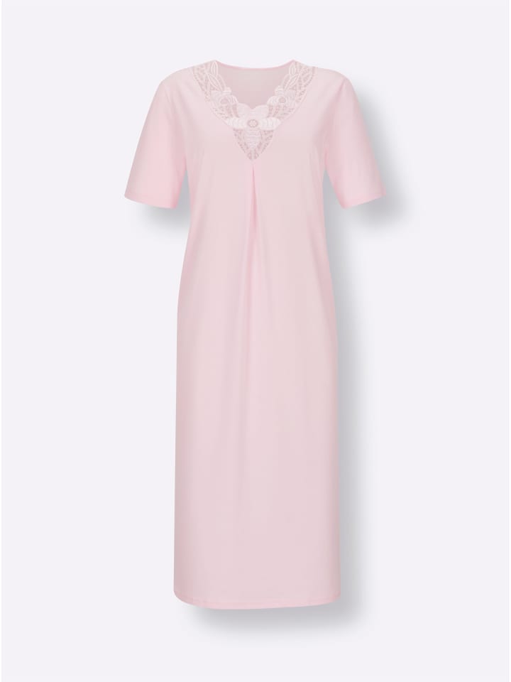 Простая элегантность с изысканным кружевом! Ночная рубашка с широким вышитым кружевом на V-образном вырезе. Приятная для кожи и невероятно мягкая. Трикотаж. Поддерживает инициативу «Хлопок, сделанный в Африке».