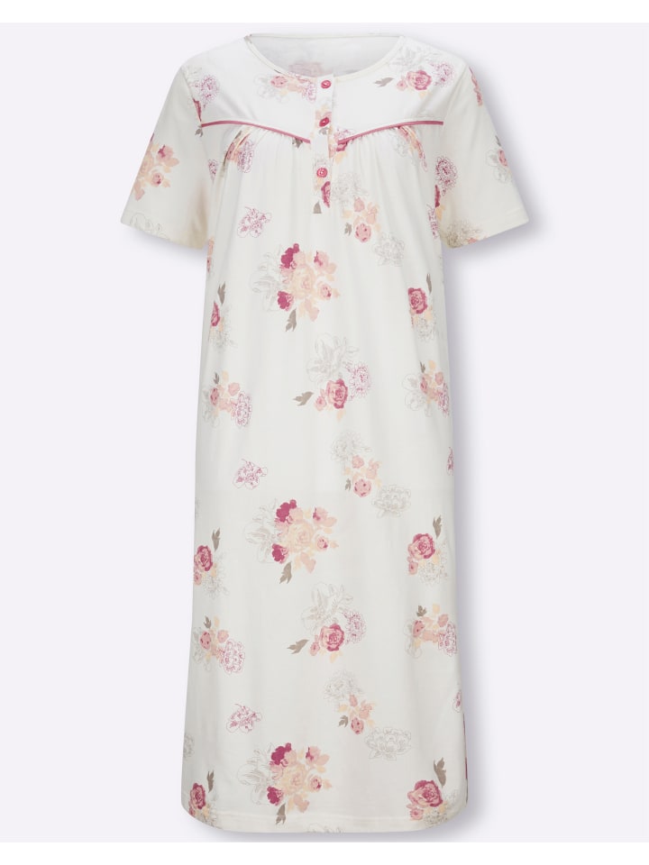 Неподвластная времени ночная рубашка с романтическим цветочным рисунком. Женственный силуэт с круглым вырезом, застегивающимся на пуговицы и легкой сборкой, а также кокеткой на груди с красивой контрастной окантовкой. Трикотаж. Сертифицировано GOTS.