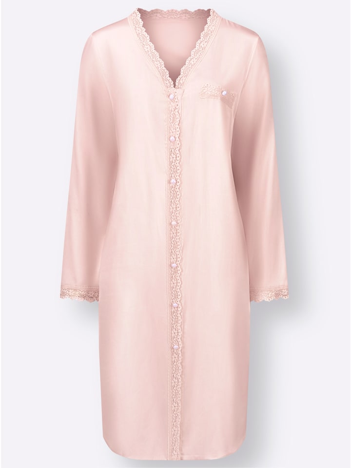 Очень женственная ночная рубашка от Cybèle с атласным блеском. Кружево в тон украшено V-образным вырезом, планкой с имитацией пуговиц и манжетами. Две верхние пуговицы планки расстегиваются для удобства одевания и раздевания. С имитацией нагрудного кармана.