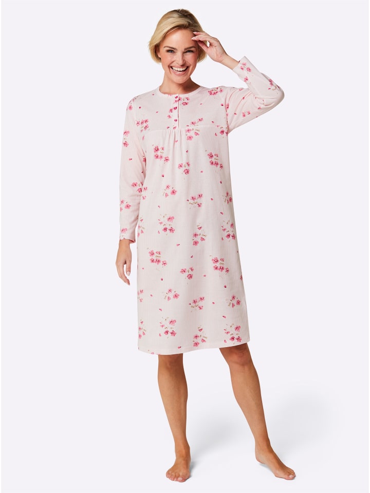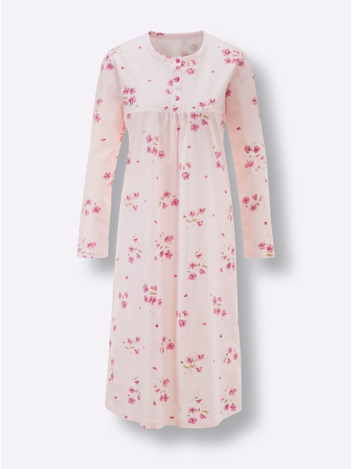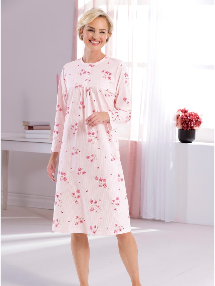 Женственный цветочный узор: ночная рубашка из мягкого, эластичного трикотажного полотна. Горизонтальный шов под короткой планкой с пуговицами украшен мелкими складками, что придает этой модели особенно комфортную драпировку!