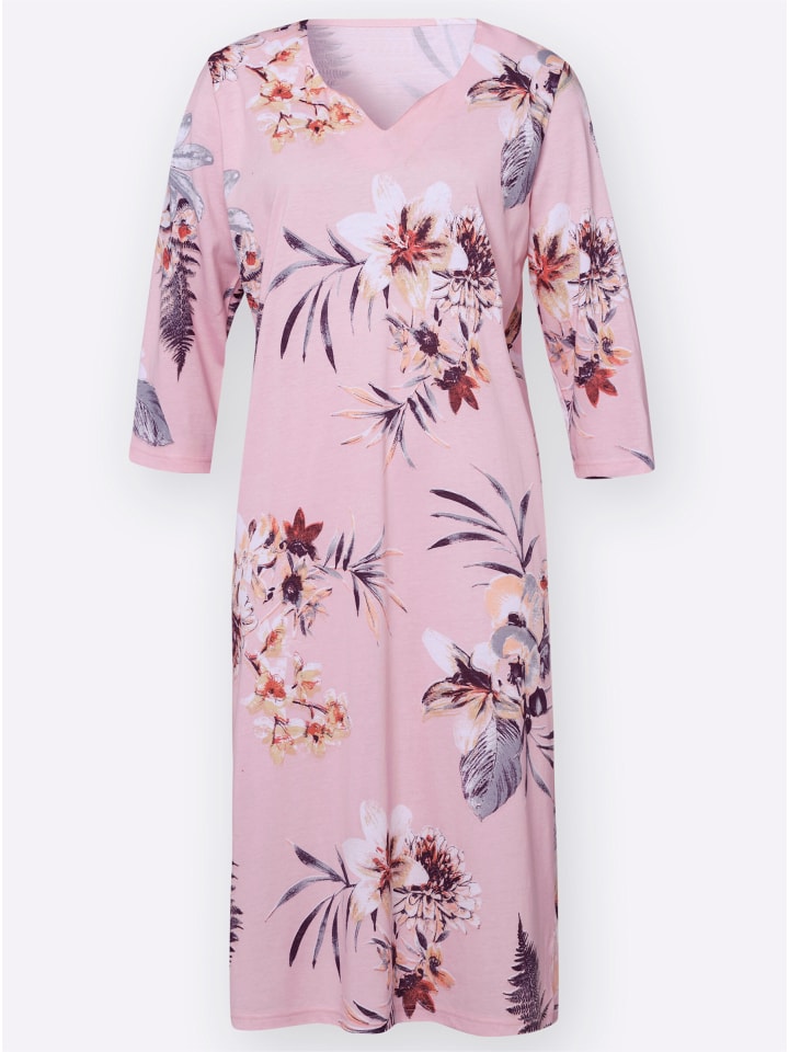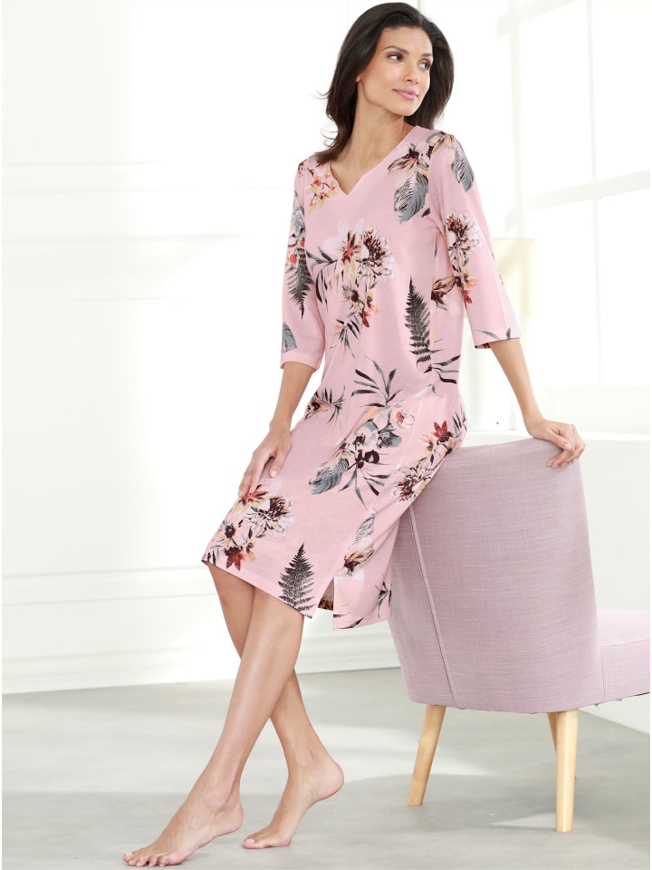 Элегантная ночная рубашка с роскошным цветочным узором. Круглый вырез с небольшим V-образным вырезом. Модные рукава три четверти. Разрез сбоку обеспечивает оптимальную свободу движений. Изготовлена из тонкого трикотажного полотна.