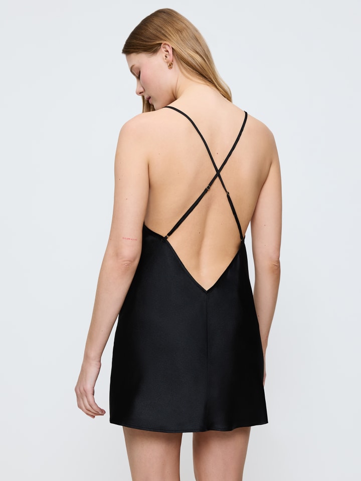 Это очаровательное платье-комбинация с глубоким вырезом на спине, перекрещивающимся с помощью бретелей, обещает незабываемые моменты, пробуждающие желание. Изысканные геометрические кружевные вставки и мерцающие металлические акценты добавляют нотку роскоши. Это платье-комбинация из глянцевого атласа, на 90% состоящего из переработанного нейлона, прекрасно облегает тело.