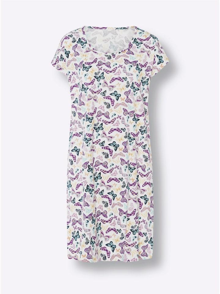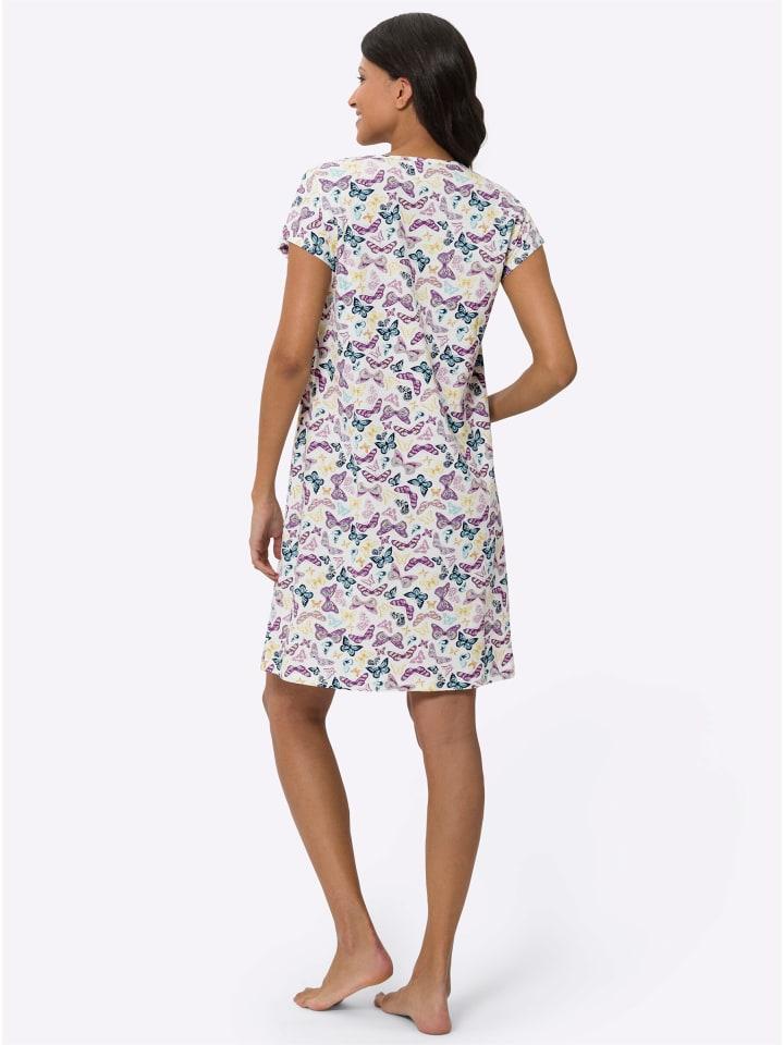 Легкая и воздушная - эта ночная рубашка с принтом в виде бесчисленных бабочек обеспечит вам комфорт в теплые ночи. Она имеет привлекательный А-образный силуэт со спущенными плечами. Изготовлена из трикотажного полотна.