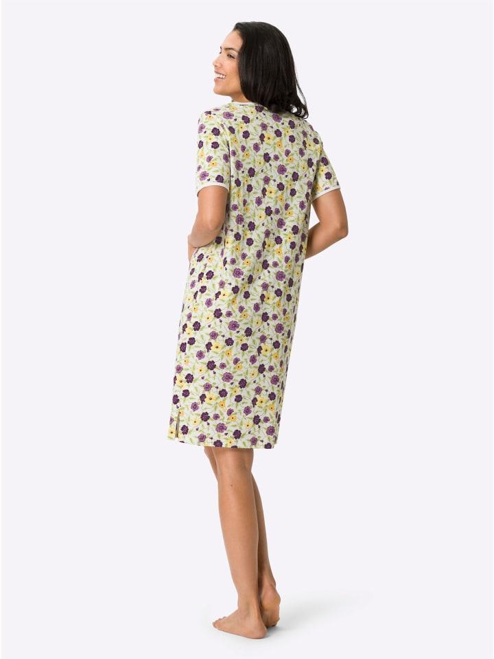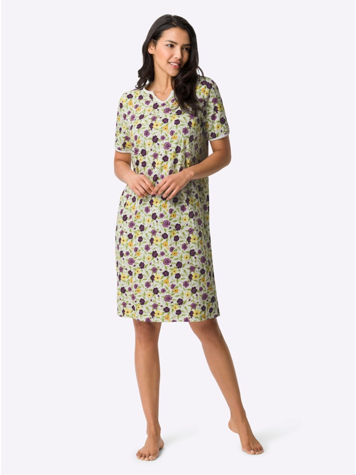 Чудесно свежий и жизнерадостный, как весна, - именно так выглядит цветочный узор на этой милой ночной рубашке. Однотонная окантовка круглого выреза с небольшим V-образным вырезом и манжет рукавов. Разрезы по бокам. Трикотаж.