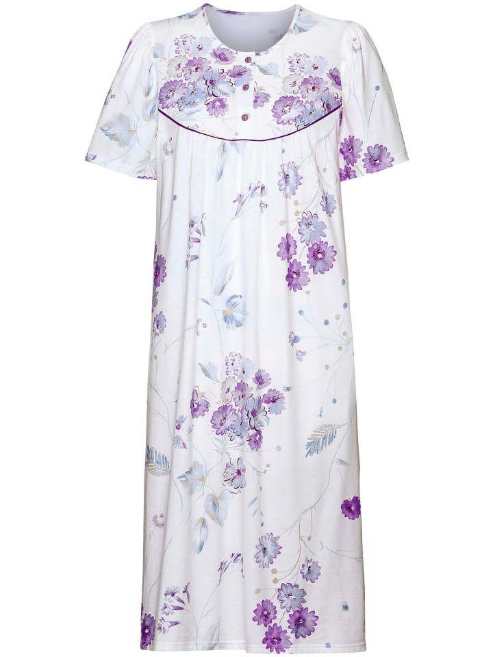 Высочайшее качество по отличной цене! Стильная ночная рубашка с цветочным рисунком. Круглый вырез горловины с короткой планкой на пуговицах и легкой сборкой спереди. Изготовлена из исключительно приятного для кожи трикотажного полотна. Сертифицировано OCS.