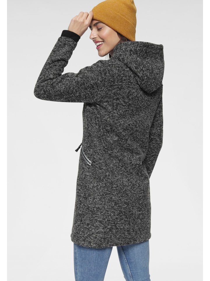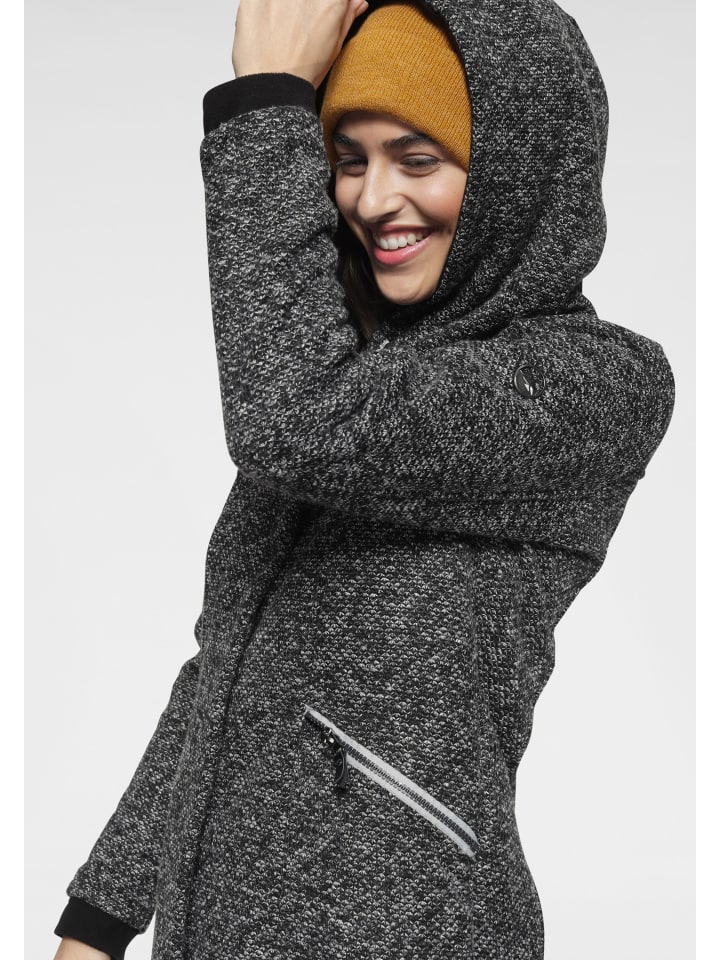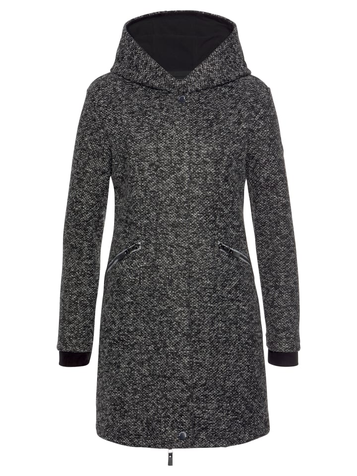 Пальто Polarino из трикотажного флиса. Имитация твида с флисовой подкладкой. Большой капюшон на подкладке. С пришитыми флисовыми манжетами. Двусторонняя молния с ветрозащитной планкой. Боковые карманы на молнии с контрастными полосками. Приталенный крой. Изготовлено из эластичного, мягкого трикотажного флиса с отличным сохранением тепла.