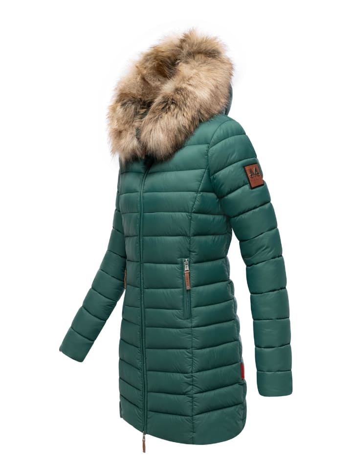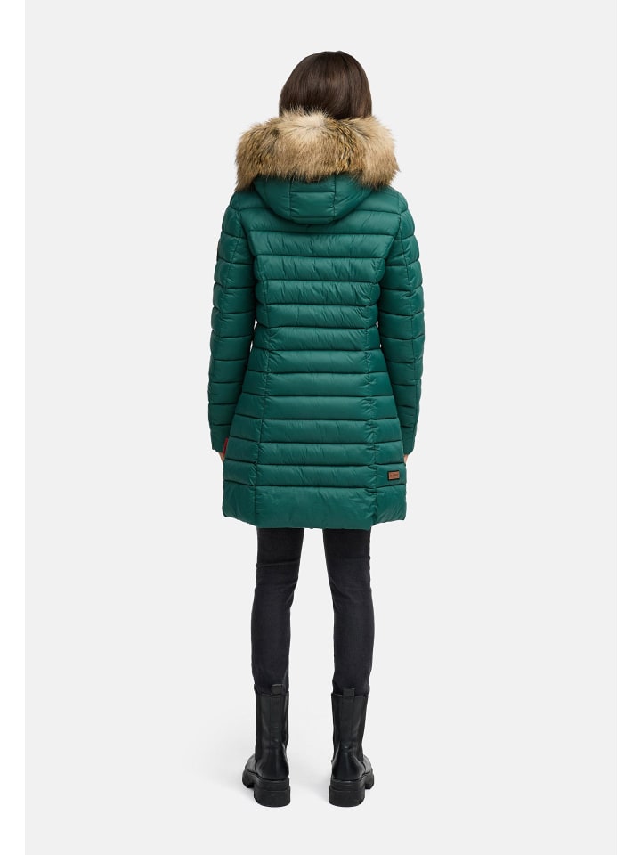 МАТЕРИАЛ: Стеганое пальто с матовым мерцающим внешним материалом, высокий комфорт при ношении благодаря мягкому и эластичному материалу, пушистый теплый искусственный мех на капюшоне