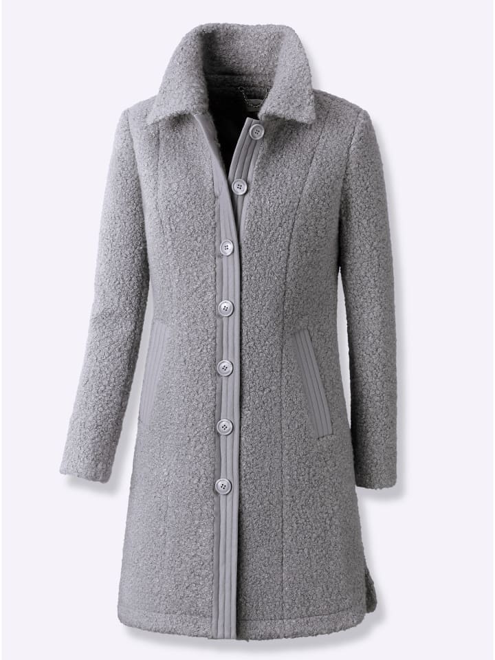Незаменимая вещь для холодных дней: пальто из согревающей ткани букле. Отложной воротник, застежка на пуговицы по всей длине, косые прорезные карманы и внутренний карман на пуговице. Низ скругленный, с боковыми разрезами.