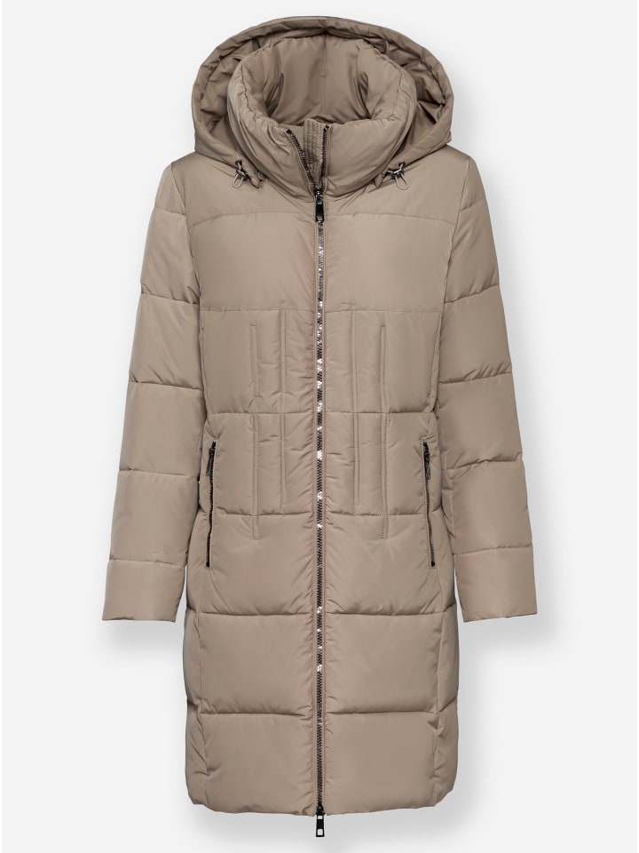 Вы будете идеально подготовлены к холодным зимним дням! Это слегка мерцающее стеганое пальто с высоким, теплым воротником-стойкой. Капюшон с легкой подкладкой отстегивается и регулируется шнурком и эластичным шнуром. Пальто застегивается на практичную двухстороннюю молнию цвета античного серебра, два кармана на молнии и один надежный внутренний карман на пуговице. Приталенные швы спереди и сзади обеспечивают оптимальную посадку. Пальто имеет современный стеганый узор с едва заметной линией талии.