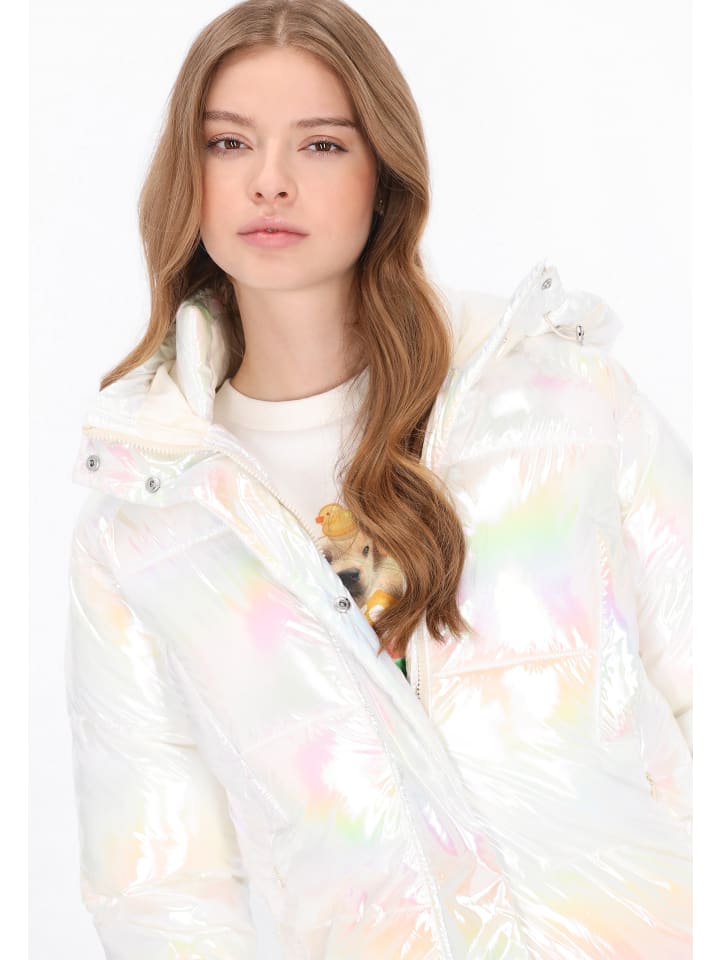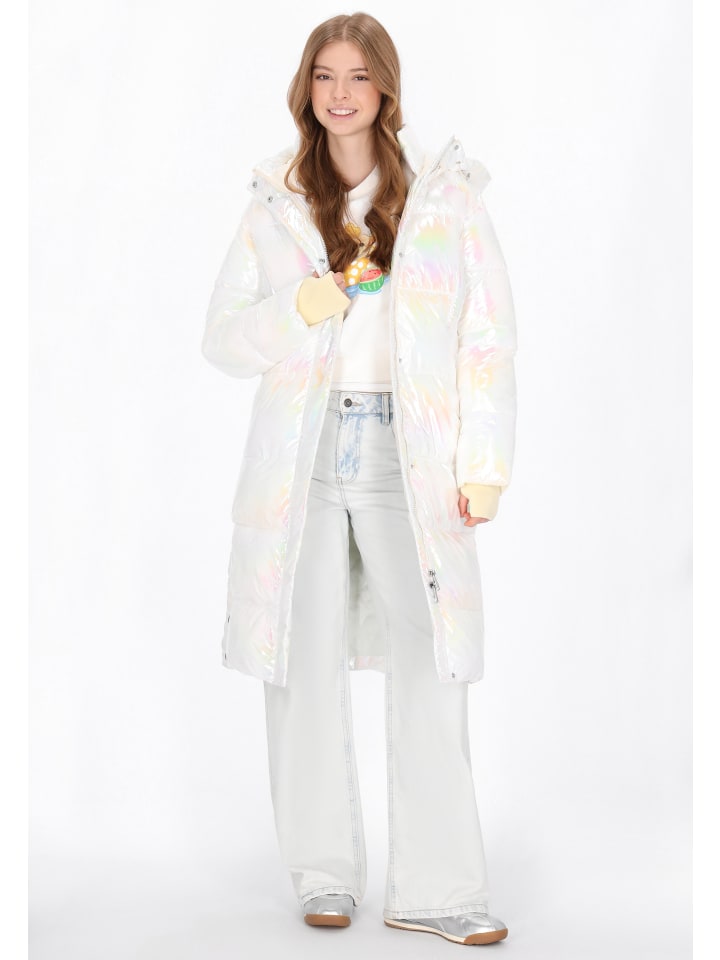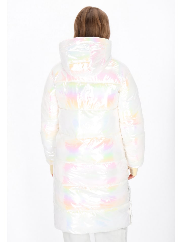 Это стильное пальто - незаменимая вещь в холодные дни. Современный голографический узор привлекает внимание и придает образу нотку молодости. Свободный крой до колен обеспечивает комфорт и свободу движений. Практичный капюшон с воротником-стойкой и кулиской эффективно защищает от ветра и холода. Длинные рукава с прорезями для больших пальцев обеспечивают дополнительный комфорт, а застежка на молнию с кнопками повышает функциональность. Вместительные карманы - еще один плюс. Это пальто сочетает в себе комфорт и современный стиль.
