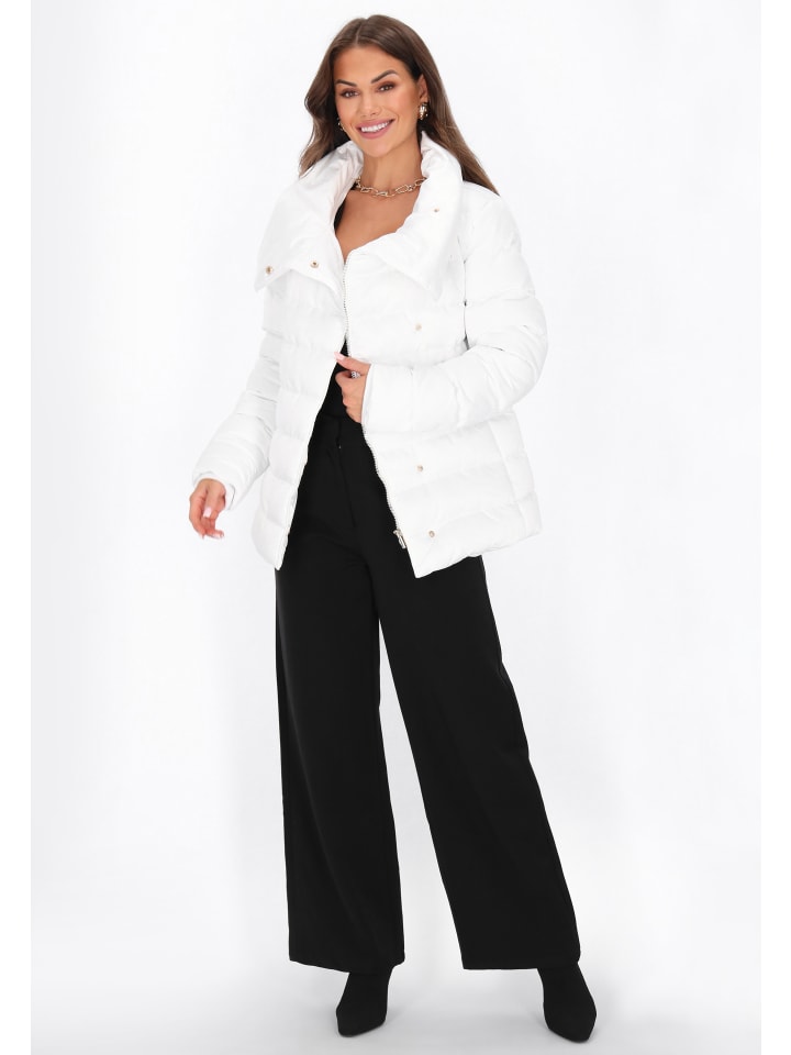 - Короткий пуховик классического кроя с воротником-стойкой и длинными рукавами