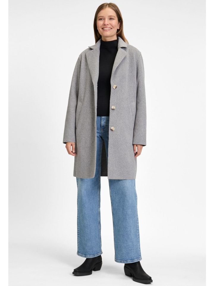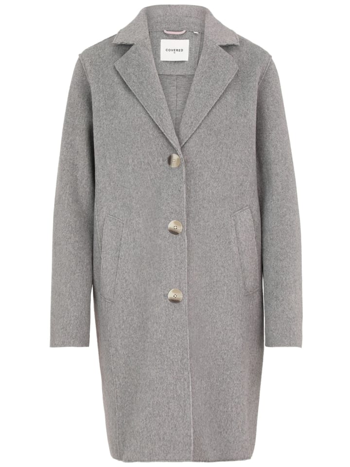 Женское пальто COVERED - идеальный компаньон в прохладные дни. Шерстяной вид пальто с боковыми карманами и заостренными лацканами. Пуговицы с имитацией рога. Модная аппликация под воротником. Необработанные края. Наше женское пальто, доступное в различных цветах и размерах, идеально подходит для прохладных месяцев.