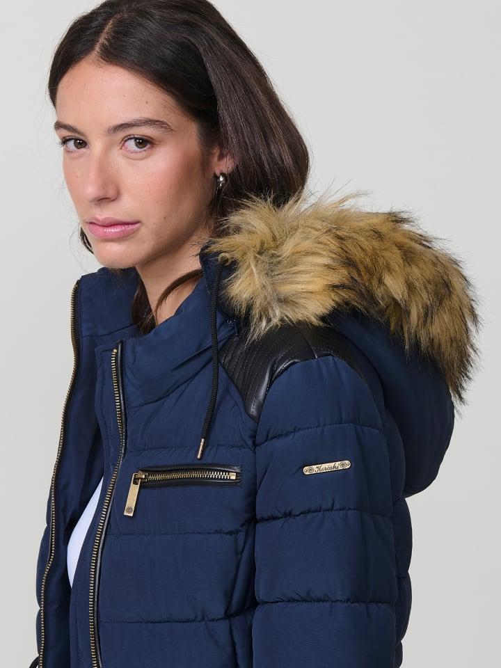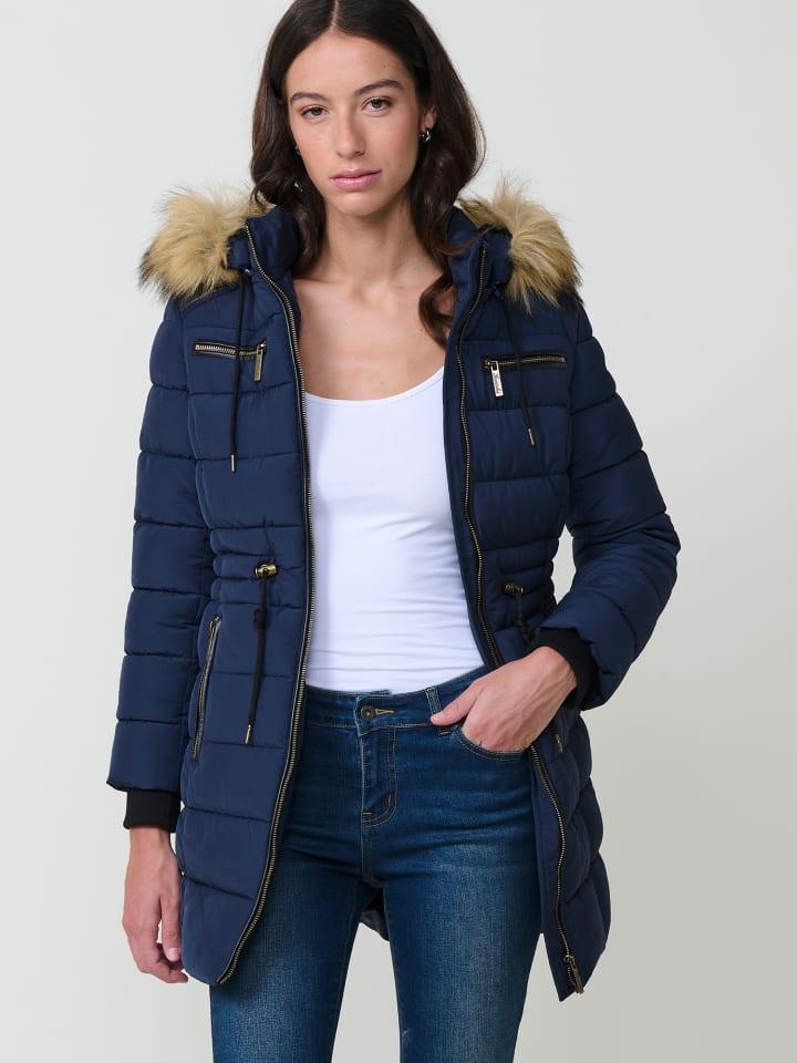 Длинная стеганая куртка с капюшоном и меховой отделкой. Застежка-молния спереди. Состав: 100% полиэстер