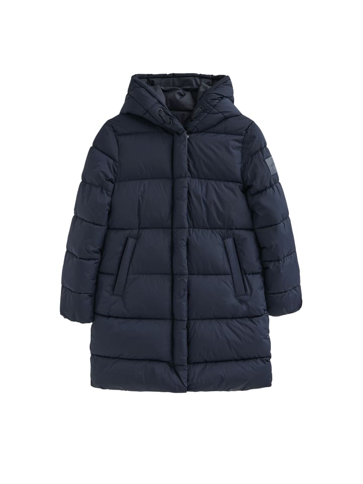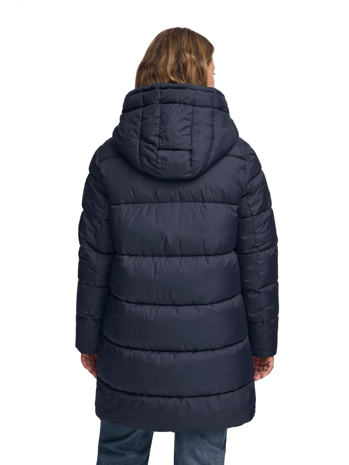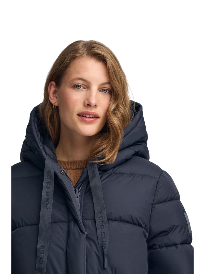 Длинная стеганая двусторонняя женская куртка с капюшоном, прямого кроя. Двойная застежка на молнию и пуговицы, а также внешние и внутренние карманы на молнии. Водоотталкивающая, ветрозащитная и дышащая ткань.