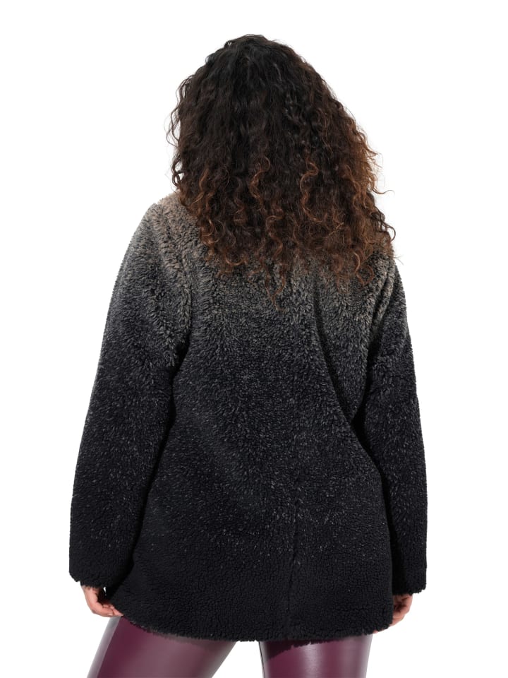 Пальто-трапеция из мягкой плюшевой ткани с модным градиентом цвета. Воротник-стойка, потайная застежка на кнопки, 2 кармана. Полностью на подкладке с карманом.