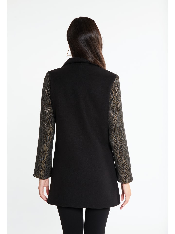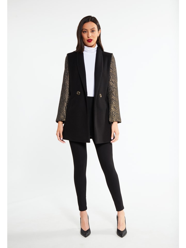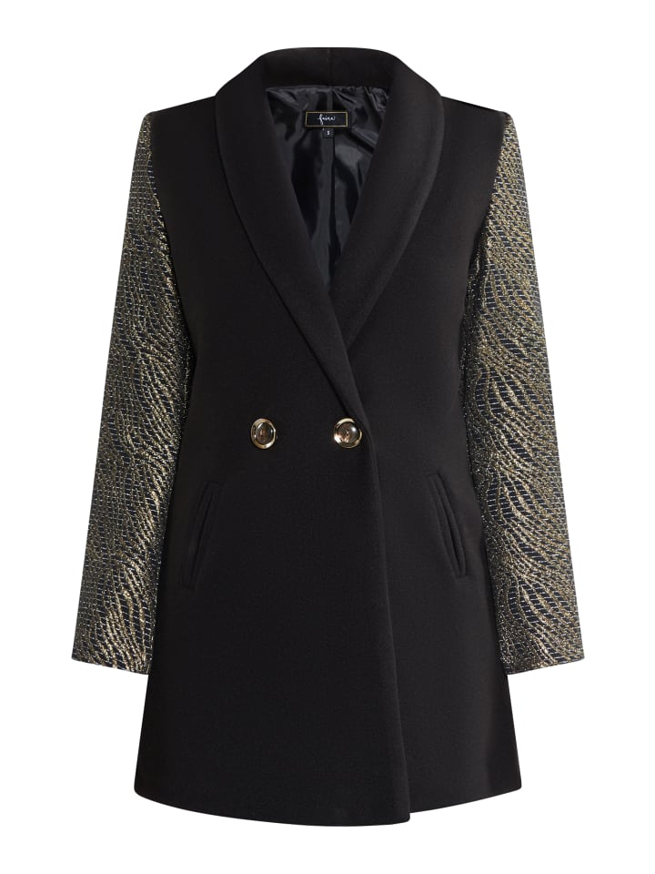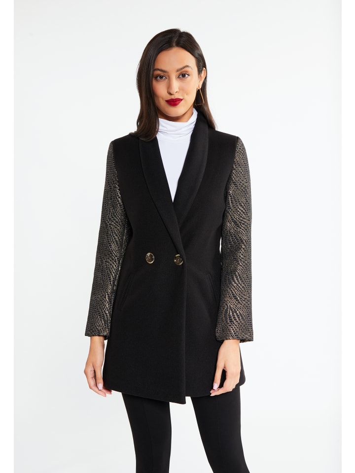 Стильное пальто прямого кроя, созданное для особых случаев. Изготовленное из высококачественной ткани, оно выглядит невероятно шикарно и элегантно. Воротник-шалька и V-образный вырез подчеркивают его классический характер. Двубортная застежка на пуговицы, длинные рукава с жаккардовым узором и практичные карманы для комфорта. Идеальное решение для элегантных мероприятий и торжественных случаев, сочетающее классический стиль с современным дизайном. Из коллекции Faina.